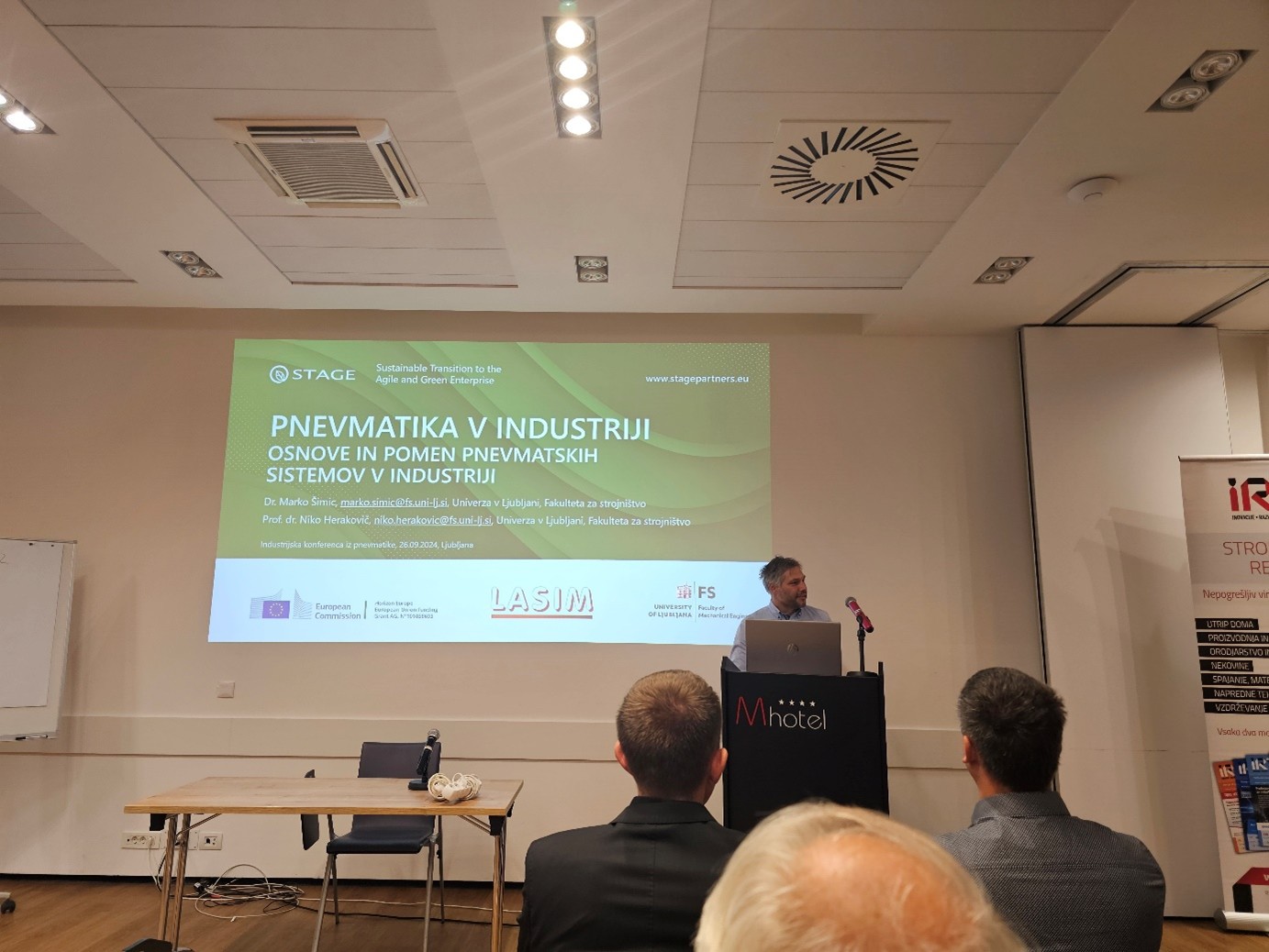 Sledilo je vabljeno predavanje za naslovom »Pnevmatika v industriji, osnove in pomen pnevmatskih sistemov v industriji« doc. dr. Marka Šimica s Fakultete za strojništvo Univerze v Ljubljani. Predstavil je trende povečevanja uporabe pnevmatičnih sistemov, po prognozah naj bi se v naslednjih 5-tih letih uporaba pnevmatičnih sistemov povečala za 40 %. Dr. Šimic je predstavil široko področje uporabe pnevmatike, poleg strege in montaže, vakumskih in mehkih prijemal, itd. Poudaril je pomembnost uporabe piezo tehnike v pnevmatiki, predstavil je številne prednosti in slabosti uporabe pnevmatike ter razlike v primerjavi s hidravliko. Nato je predstavil zgradbo pnevmatičnih sistemov, postrojenje za pripravo zraka, tlačne posode, osnovna pnevmatična krmilja in pnevmatične komponente ter podal napotke kako se lotiti razvoja in postavitve pnevmatičnih sistemov. Zaključna misel je bila, da je pnevmatika pogosto najboljša rešitev za avtomatizacijo, saj je enostavna in stroškovno učinkovita. Uroš Šučur iz podjetja HPE-CALMS je predstavil tematiko z naslovom: »Uvod v merjenje pretoka stisnjenega zraka, merilniki pretoka zraka«. Predstavil je teoretične osnove o normalnih pogojih plina, termodinamične osnove, primerjava različnih pogojev in različnih tehnologij za merjenje pretoka zraka. Sledila je razlaga merilnikov pretoka zraka na podlagi termične disperzije. Predavatelj je jasno predstavil kaj ej potrebno za pravilno izbiro, montažo, kalibracijo in uporabo merilnika pretoka stisnjenega zraka.